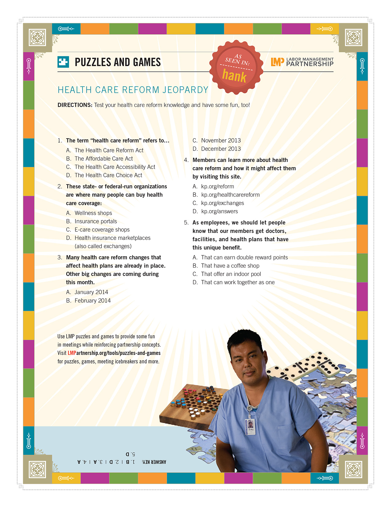TOOLS Health Care Reform Jeopardy Share Tweet Email Format:PDFSize:8.5" x 11"Intended audience:Frontline workers and managersBest used:This jeopardy game tests your health care reform knowledge. Use it to provide some variety and fun at a team meeting.Related tools: Hank Libs: Plan for Time Off Hank Libs: Greeting Power Puzzles and Games Answers (Summer 2013 Hank) Hank Libs: Smooth or Crunchy? Hank Libs: Feel Like a Juggler? Download PDF 120 people found this helpful. Was it helpful to you? YesNo