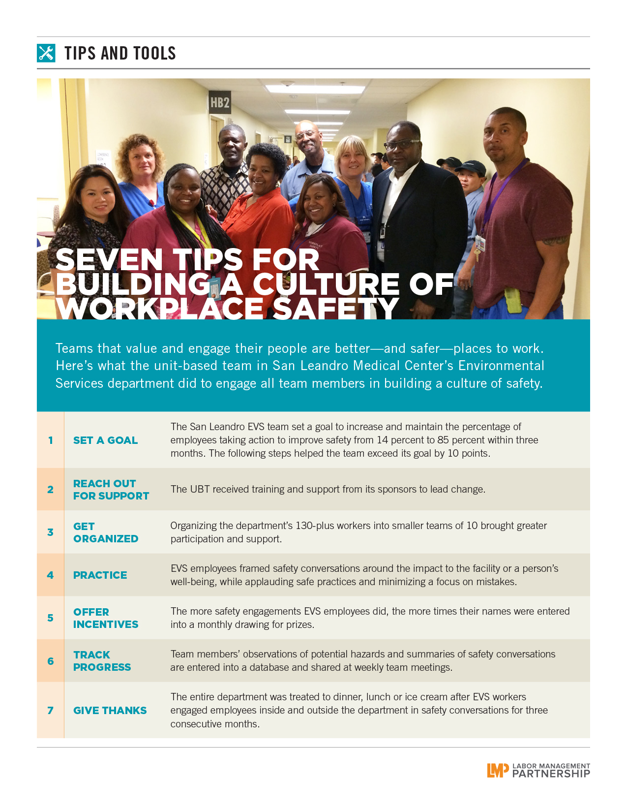 Seven steps that helped one EVS team change the culture and reduce workplace injuries. Use to encourage workplace safety conversations and practices that have worked elsewhere.