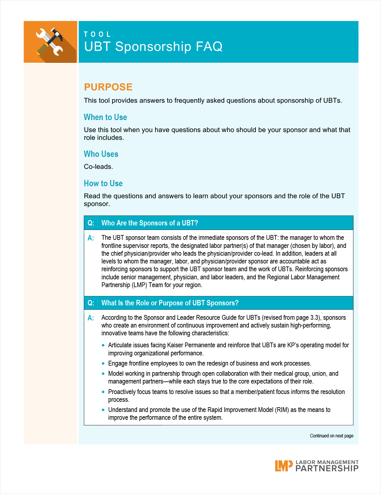TOOLS UBT Sponsorship Share Tweet Email Format:PDFSize:8.5" x 11" Intended audience:UBT co-leadsBest used:This guide answers your questions about who should be your sponsor and what that role includes. Related tools: Sponsor Working Agreements Seeking Help From Your Sponsor Sponsorship Planning Meeting Sponsor Behaviors Self-Assessment Supporting UBT Co-Leads Download PDF 114 people found this helpful. Was it helpful to you? YesNo
